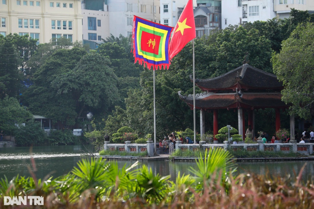 | Các điểm thắng cảnh, di tích quanh hồ Gươm được đặt nhiều pa nô, biểu ngữ, cờ, hoa tuyên truyền. |