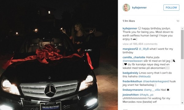 Hôm qua, tài khoản Instagram của Kylie Jenner và cô bạn thân Jordyn Woods cùng đăng tải hình ảnh Jordyn bên cạnh một chiếc Mercedes-Benz màu đen được thắt nơ đỏ. Ngoài bức ảnh, cô em gái nổi tiếng của cô Kim “siêu vòng ba” còn đăng tải lời chúc mừng sinh nhật và lời cảm ơn dành cho người bạn thân.
