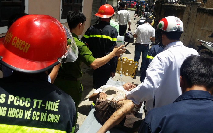 Ngay khi nạn nhân được đưa ra ngoài, lực lượng y tế và cảnh sát PCCC đã đưa nạn nhân lên xe cấp cứu chờ sẵn thẳng tiến về Bệnh viện TW Huế.