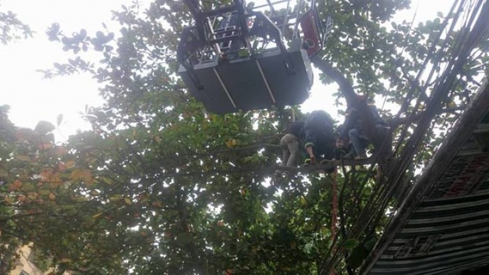 Khuyên nhủ bất thành, người dân đã báo cho cơ quan công an. Ngay sau đó, lực lượng chức năng đã có mặt, tiến hành vận động nhưng cũng không có hiệu quả. Để bảo đảm an toàn cho người này, cảnh sát đã căng phao cứu hộ phía dưới, đồng thời huy động xe thang để tiếp cận vị trí trên cao.
