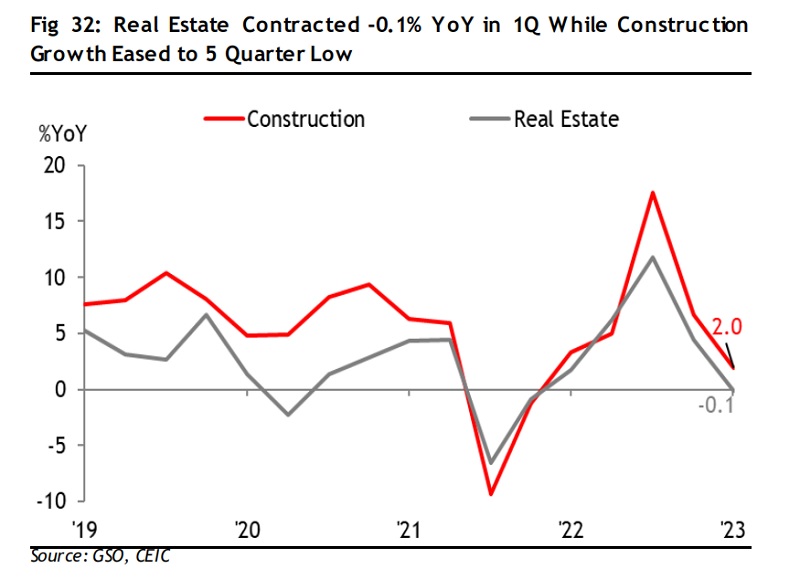 Bất động sản và các hoạt động có liên quan chiếm khoảng 12% GDP thực. Các nhà phát triển bất động sản sử dụng quá nhiều đòn bẩy tài chính đang bị ảnh hưởng bởi doanh số yếu và khủng hoảng thanh khoản do thị trường trái phiếu doanh nghiệp hạn chế hơn bởi các quy định ban hành và các vụ việc đã xảy ra trong năm 2022.