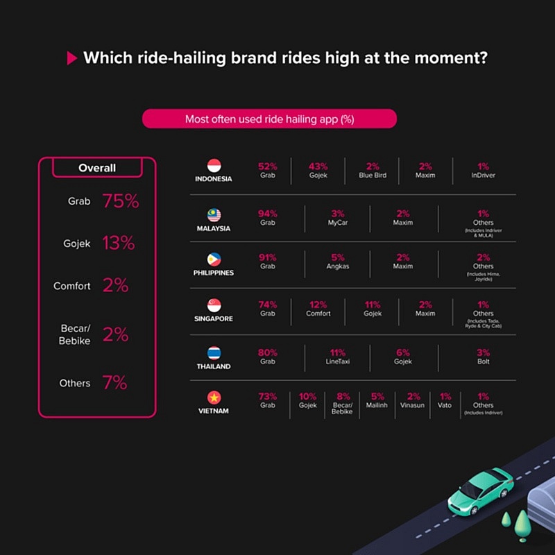 Trong khi đó, theo Blackbox, dịch vụ gọi xe đã trở thành một phần thiết yếu trong cuộc sống hàng ngày ở Đông Nam Á. Hơn một nửa số người được hỏi (53%) đã sử dụng các ứng dụng gọi xe trong thời gian khảo sát. Nhu cầu gọi xe trong khu vực càng tăng mạnh những năm gần đây khi Covid-19 làm thay đổi thói quen di chuyển cũng như cách thức làm việc, tổ chức cuộc sống của đại bộ phận người dân.