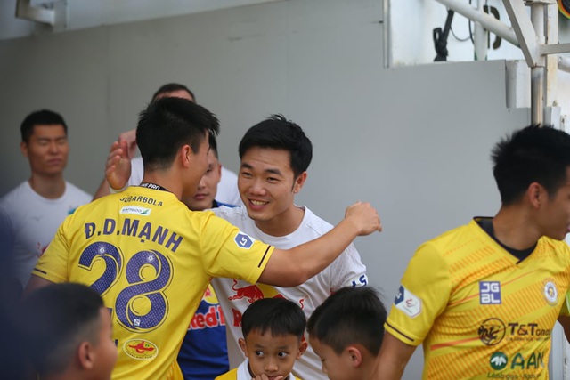| Duy Mạnh chào hỏi Xuân Trường trước khi bước vào trận đấu ở sân Pleiku. |