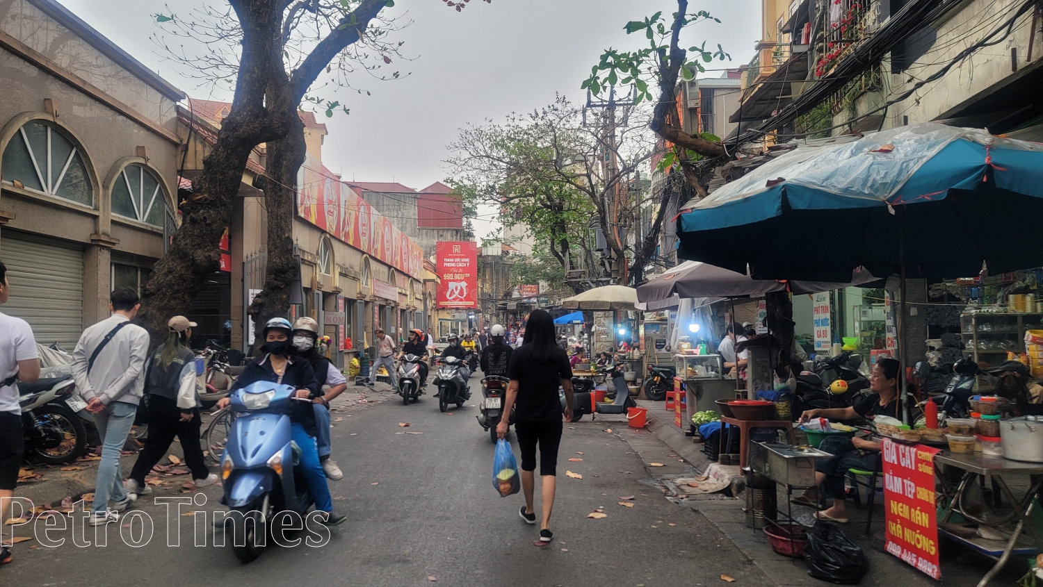 | Gần khu chợ Ngọc Hà, các tiểu thương vẫn bày hàng hóa tràn ra vỉa hè. |