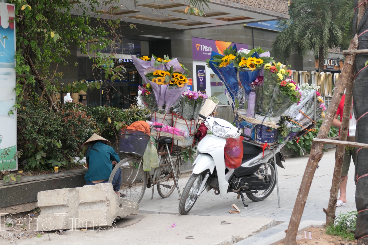 | Tại đường Xuân Diệu, gánh hàng hoa vẫn ngang nhiên dựng xe trên vỉa hè để bán hàng. |