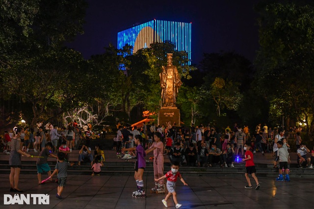 | Ghi nhận vào khoảng 20h15 trong ngày nghỉ lễ đầu tiên, lượng người đổ ra khu vực quảng trường Đông Kinh Nghĩa Thục tương đối đông đúc. Nhiều gia đình dẫn theo con nhỏ dạo chơi, nhóm các thanh niên trẻ tụ tập chủ yếu trước đài phun nước quảng trường. |
