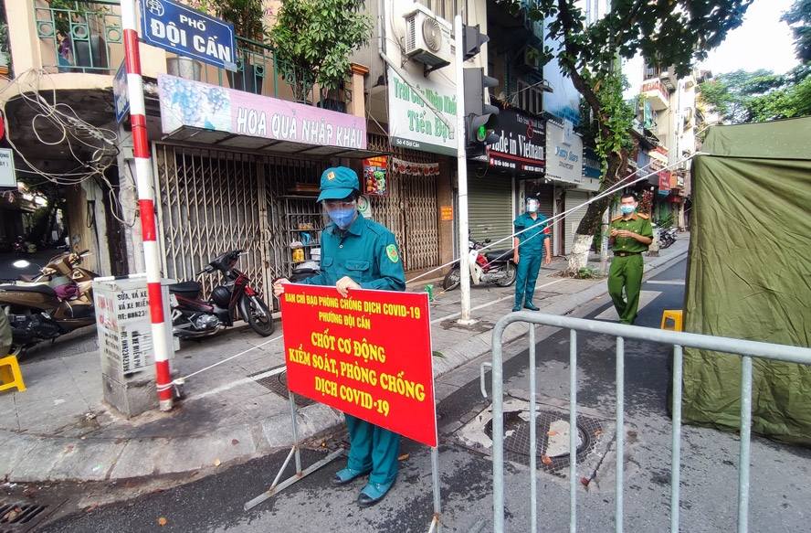 | Hàng rào chốt kiểm soát được lập tại đoạn nhà số 1 Đội Cấn |