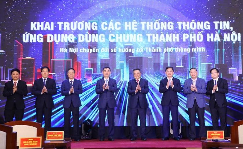 | Lãnh đạo TP Hà Nội và các đại biểu thực hiện nghi thức khai trương các hệ thống thông tin, ứng dụng dùng chung Thành phố |