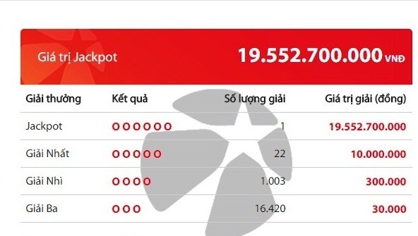 Theo Vietlott, trong kỳ quay số mở thưởng thứ 306 của loại hình xổ số tự chọn Mega 6/45 (6/7) đơn vị này đã xác định có một tấm vé may mắn trúng thưởng hơn 19,5 tỷ đồng. Dãy số trúng độc đắc bao gồm: 22 – 26 – 33 – 34 – 38 – 42.