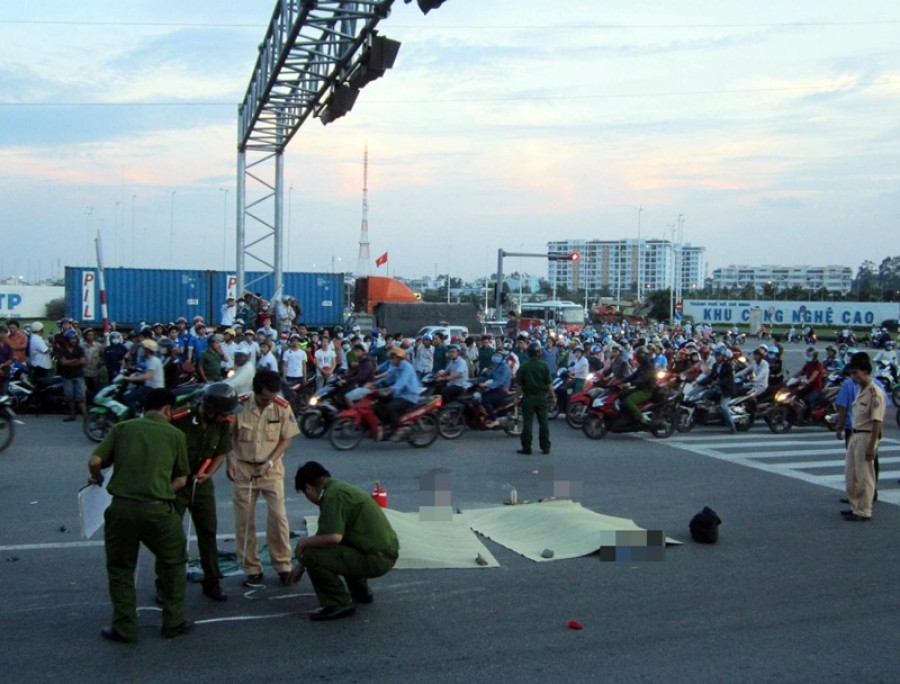 Khi đến điểm trên, hai người bị xe container biển số 51C-486.81 lao đến tông trực diện, bánh xe cán ngang người khiến hai người tử vong tại chỗ. Chiếc xe máy bị kéo lê nằm gọn dưới gầm xe container và bị kéo lê nhiều mét.