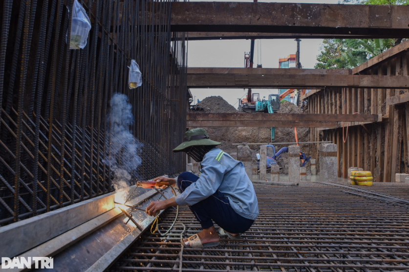 Bên dưới hầm chui Trần Quốc Hoàn - Phan Thúc Duyện, kết cấu đà chống vách đã hoàn thiện. Công nhân đang hàn các lớp kết cấu thép tường vây.
