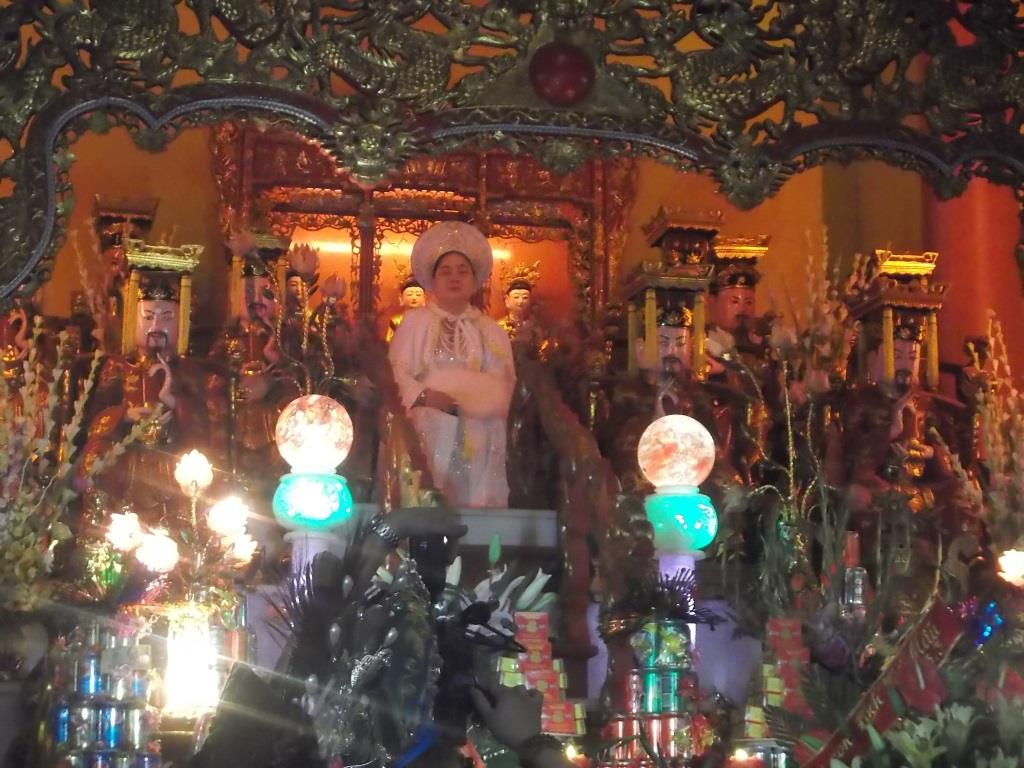 Bên trong "Mẫu" The mặc bộ đồ trắng toát, ngồi xếp ngang với các tượng thần trên tòa bảo tháp