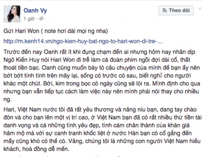 Trên trang cá nhân của mình, ca sĩ Vy Oanh đã lên tiếng chỉ đích danh Hari Won thiếu chuyên nghiệp hay giả bộ nói giọng lơ lớ, không biết nghĩ cho người khác gây ảnh hưởng không nhỏ tới thời gian và công việc cũng những người cùng cộng tác, trong đó có chính Vy Oanh.