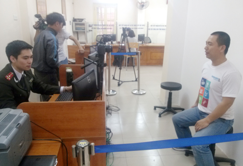 Cán bộ Phòng Quản lý xuất nhập cảnh Hà Nội đang chụp và in ảnh trực tiếp lên hộ chiếu cho công dân