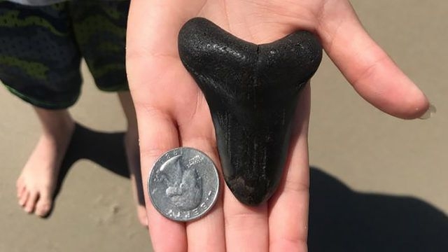 | Chiếc răng cá mập megalodon có niên đại gần 3 triệu năm được tìm thấy trên bờ biển. |