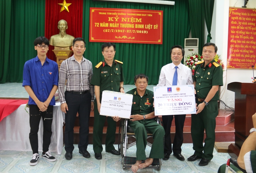 Chiều ngày 24/7, Đoàn công tác đã đến thăm hỏi, động viên và tặng quà cho các thương, bệnh binh hiện đang điều dưỡng tại Trung tâm điều dưỡng thương binh Duy Tiên (tỉnh Hà Nam). Trung tâm điều dưỡng thương binh Duy Tiên được thành lập từ năm 1957. Trung tâm hiện đang nuôi dưỡng và phục hồi chức năng cho 60 thương, bệnh binh đến từ 18 tỉnh, thành phố trên cả nước.