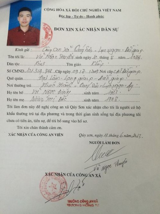 Theo Đơn xin xác nhận dân sự của Vũ Ngọc Thuyển tại xã Quý Sơn - Lục Ngạn (Bắc Giang), bị can này ghi rõ: “Tôi làm đơn này đề nghị Công an xã Quý Sơn xác nhận cho tôi là người có hộ khẩu thường trú tại địa phương và trong thời gian sinh sống tại địa phương, tôi chưa có tiền án, tiền sự để tôi bổ sung vào hộ sơ”. Tấm đơn này được ông trưởng công an xã Trương Hồng Tư ký, đóng dấu vào ngày 4/6/2013, tức 3 tháng sau ngày Thuyển bị khởi tố.