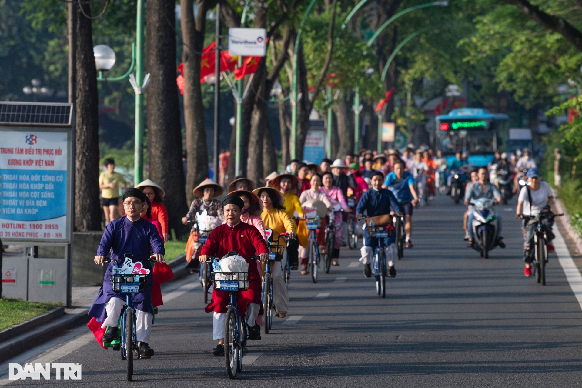 Đoàn người mặc áo dài đạp xe đi qua di tích Ô Quan Chưởng, khu vực phố cổ với đông đúc hoạt động của người dân vào buổi sáng.