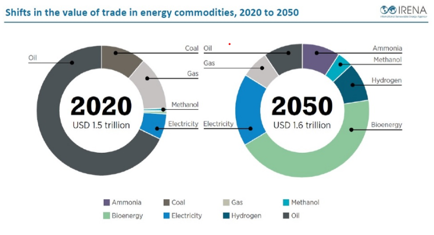 Thương mại xuyên biên giới về hydro dự kiến sẽ tăng trưởng đáng kể và hiện có hơn 30 quốc gia và khu vực đang lên kế hoạch cho các hoạt động thương mại hydro tích cực. Một số quốc gia sẽ nhập khẩu hydro và đang triển khai chính sách ngoại giao hydro chuyên dụng như Nhật Bản và Đức. Các nhà xuất khẩu nhiên liệu hóa thạch ngày càng coi hydro sạch là một cách hấp dẫn để đa dạng hóa nền kinh tế của họ như Úc, Oman, Nga, Saudi Arabia và UAE. Tuy nhiên, những quốc gia này cần những chiến lược rộng lớn hơn vì hydro không bù đắp được doanh thu từ sản lượng dầu khí bị mất. Điều này được thấy rõ trong hình 2. Theo đó, tổng chi phí xuất khẩu/nhập khẩu hydro và các dẫn xuất (amoniac, methanol) vào năm 2050 sẽ ít hơn nhiều so với doanh thu thương mại từ dầu thô.