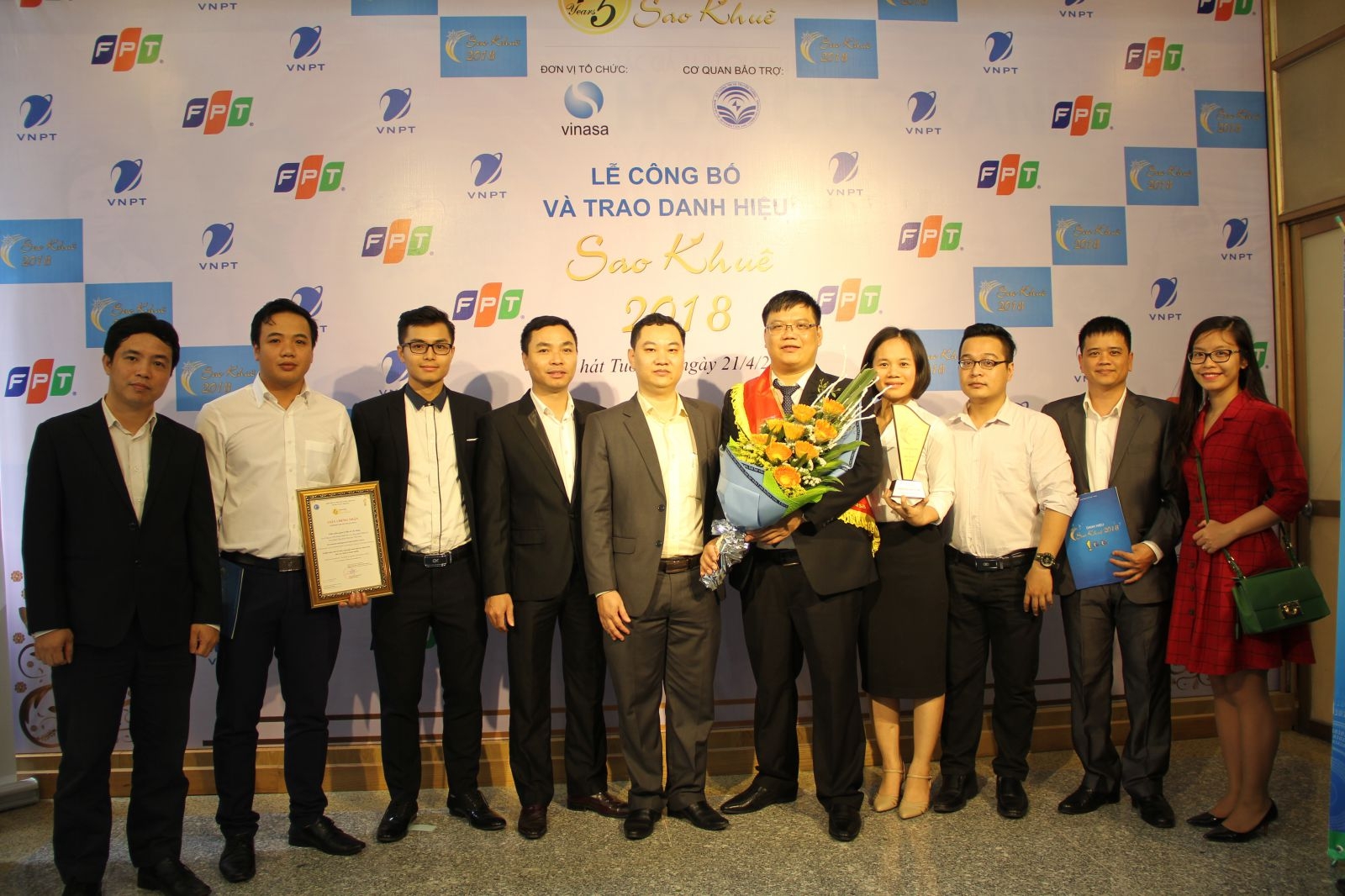 | Ông Phạm Ngọc Hiển – Phó Giám đốc EVNICT chụp ảnh cùng nhóm dự án phát triển phần mềm IMIS trong buổi lễ công bố và trao danh hiệu Sao Khuê 2018 |