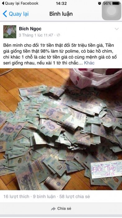 Điển hình, tài khoản facebook cá nhân có tên “Bích Ngọc” rao: “Bên mình cho đổi 1 triệu tiền thật lấy 5 triệu tiền giả. Tiền giả giống tiền thật 98% làm từ polymer, có hình chìm, chỉ khác chỗ là các tờ tiền giả cùng mệnh giá có số seri giống nhau. Nếu xài 1 tờ thì chắc chắn không phát hiện, đổ xăng, đi chợ, mua hàng tạp hóa đều ok hết, chỉ có ra ngân hàng đối chiếu số seri mới bị phát hiện thôi…”.