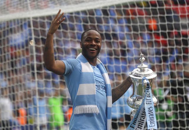 | Sterling cầm cúp khoe với khán giả, anh còn giơ ba ngón tay báo hiệu mình đã ghi ba bàn |