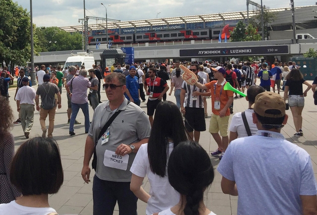 | Người đàn ông này giơ tấm bảng "Need Ticket" (Cần vé) ngay bên ngoài sân Luzhniki |