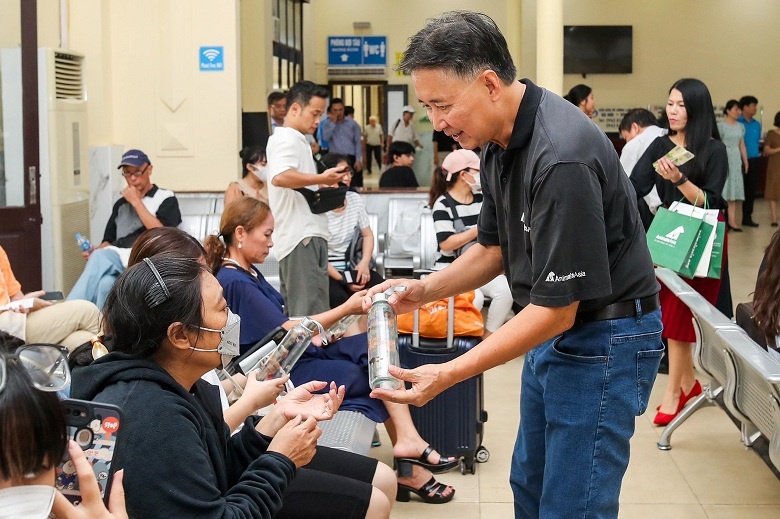 | TS Tuấn Bendixsen trưởng đại diện Tổ chức Động vật châu Á tặng quà các hành khách đi tàu. |