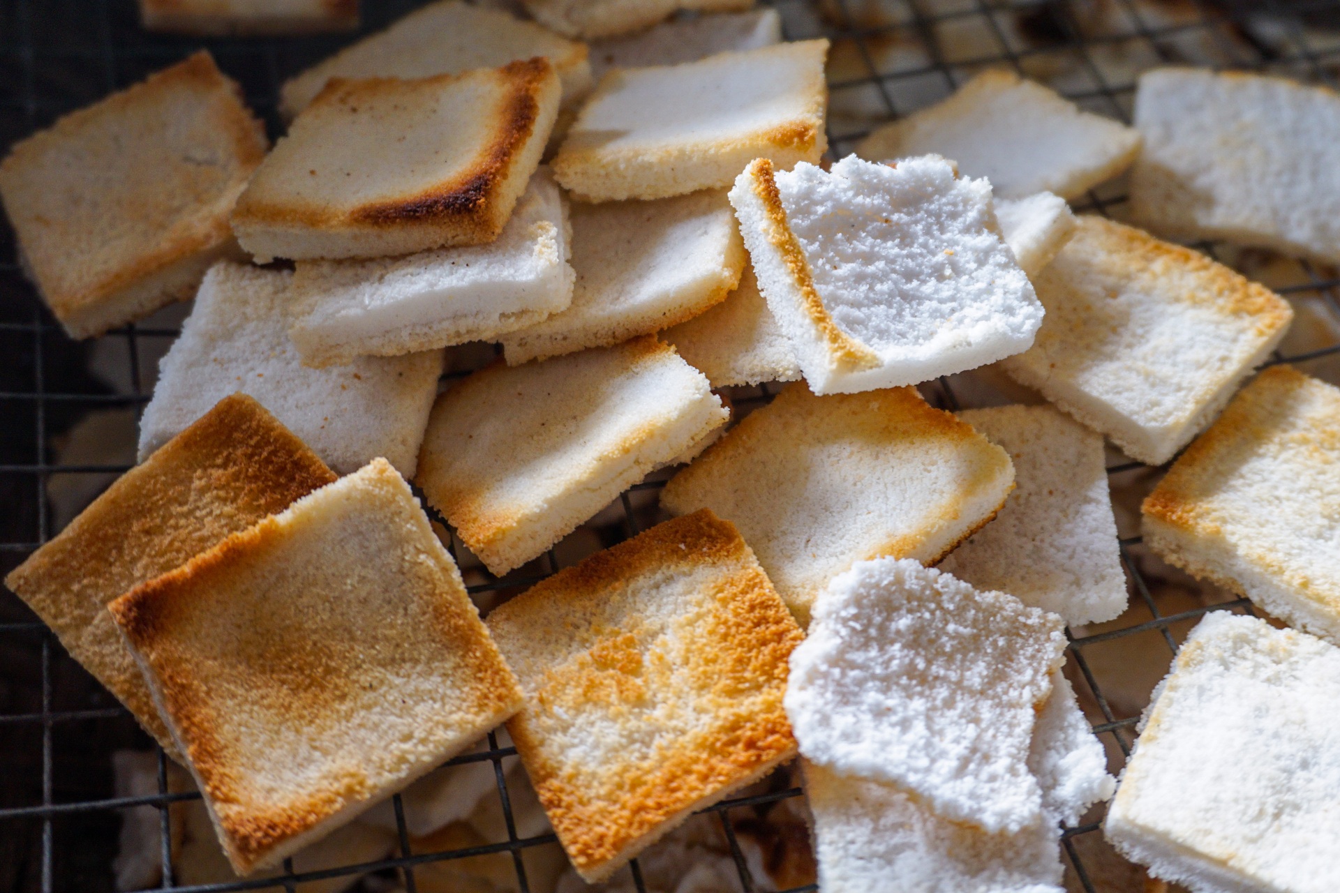 Khi bánh được hấp chín, người thợ sẽ tận dụng than của lò nấu để nướng bánh. Trong quá trình nướng, lửa được điều chỉnh linh hoạt để giữ cho bánh luôn giòn. Từ các công đoạn nấu, nướng bánh phải trải qua 7 lần lửa trên bếp than hồng nên bánh khô mè còn được gọi là bánh "bảy lửa".