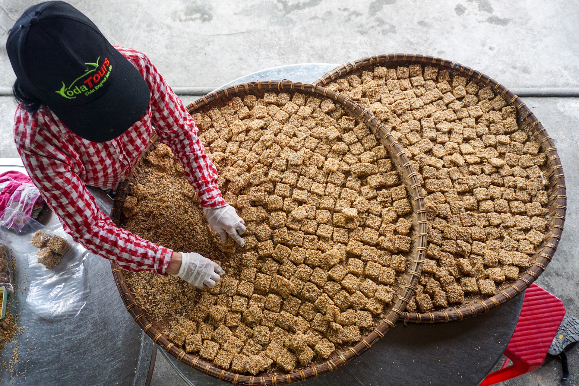 "Đường được hòa với nước theo tỷ lệ riêng, sau đó thắng cho tới, khi nào đường kéo sợi vàng óng là đạt, thêm chút gừng để dậy mùi thơm. Nếu nước đường nấu đạt thì bánh sẽ mềm dẻo, để được lâu, ngược lại bánh sẽ bị khô cứng và dễ vỡ vụn", bà Nghĩ cho hay.
