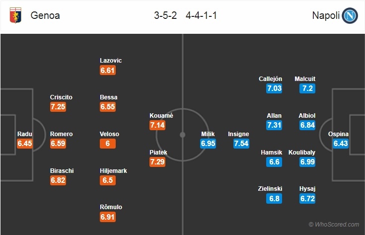 * Genoa: Federico Marchetti, Andrea Favilli, Nicolás Spolli, Sandro (chấn thương). * Napoli: Vlad Chiriches, Amin Younes (chấn thương); Dries Mertens (không chắc chắn). ĐỘI HÌNH DỰ KIẾN