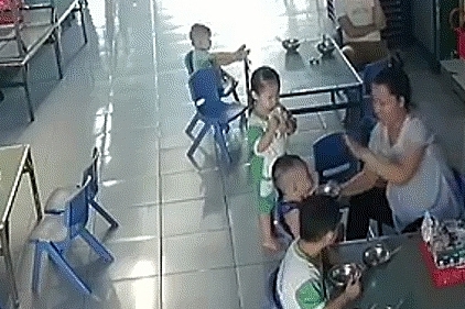 | Ảnh cắt từ clip ghi lại cảnh bạo hành trẻ ở trường mầm non tư thục Hoa Bách Hợp, huyện Đức Hòa, tỉnh Long An |