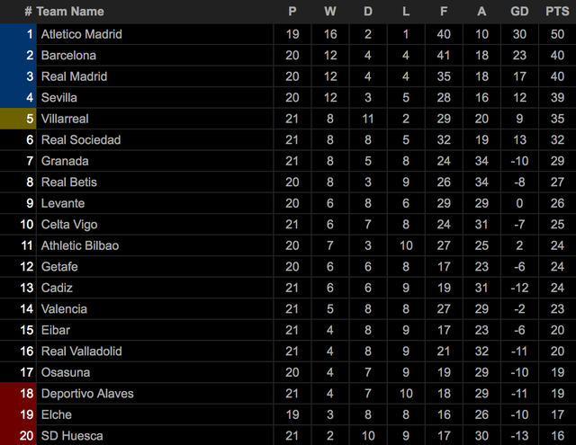 | Atleticp dẫn đầu La Liga với 50 điểm, hơn hai địch thủ Barcelona và Real Madrid 10 điểm. Luis Suarez cũng đang dẫn đầu danh sách Vua phá lưới với 14 bàn thắng. |