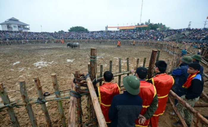 | Rào chắn được lắp đặt hai vòng chắc chắn để chuẩn bị cho những màn đấu nảy lửa của những chú trâu chọi. |