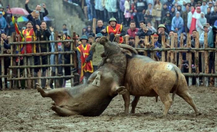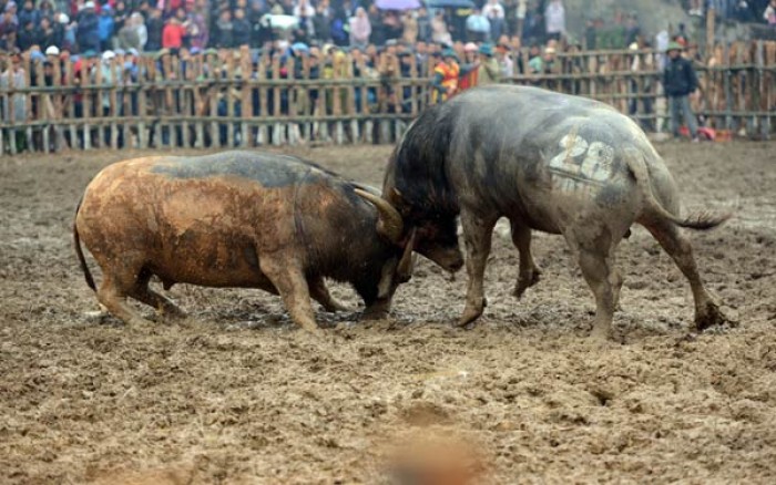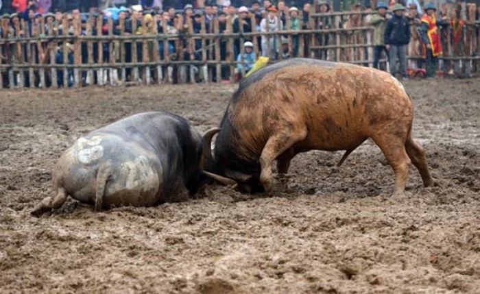 | Hai trâu chọi đọ sừng trên vũng bùn. |