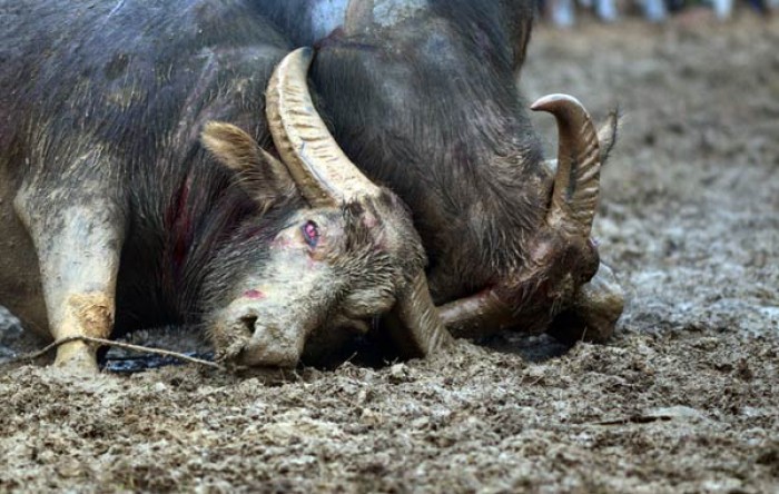 | Một trâu chọi nằm quỵ trên sân đấu sau đòn hổ lao của đối thủ. |