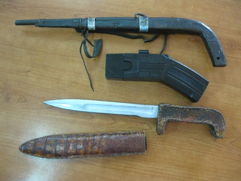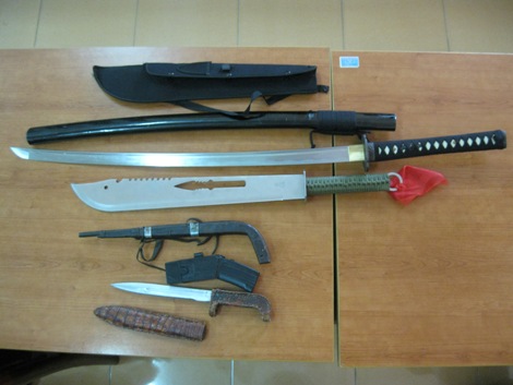Tiến hành kiểm tra, lực lượng làm nhiệm vụ phát hiện trên ghế trước cạnh ghế lái một khẩu súng tự chế bắn đạn hoa cải, một súng bắn điện, một thanh kiếm, một thanh đao và hai con dao găm.