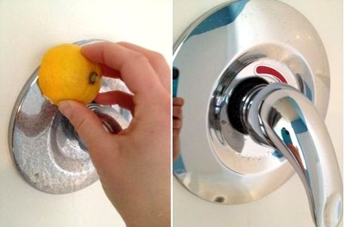 Thay vì lau dọn phòng tắm bằng hoá chất dễ ăn mòn, một phương pháp tự nhiên rất hiệu quả sẽ được bạn áp dụng ngay sau đây: vắt 6 quả chanh lấy nước và đổ vào bình xịt. Axit citric sẽ làm bỏng những chất cặn bẩn cứng đầu và dễ dàng chà sạch lại bằng xà bông. Ngoài ra, tính chất kháng khuẩn và khử trùng cũng sẽ làm sạch sẽ không gian nhà tắm.