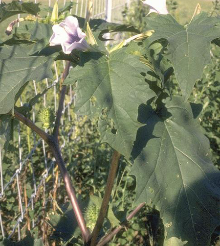 Còn có các tên gọi khác như Thorn Apple (táo gai), hay Jamestown Weed (cỏ dại của vùng Jamestown). Cây nhỏ, thân dày, có nhiều nhánh. Lá màu xanh lục hay tím và tỏa ra mùi khó chịu. Hoa hình loa kèn, năm cánh nhọn, màu trắng hay màu tím nhạt. Trái cứng, có gai nhọn, có nơi gọi là “táo gai” chứa nhiều hạt. Những hạt này chứa loại chất độc, nếu dính phải sẽ gặp những triệu chứng như khát nước bất thường, rối loạn tầm nhìn, mê sảng, hôn mê, cuối cùng thường là tử vong.