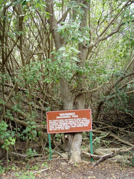 Ở những nơi xuất hiện loài cây này, trên mỗi cây đều được đánh dấu "X” màu đỏ, và dòng chữ cảnh báo: "Cảnh báo! Lá, vỏ và quả của loại cây này chứa một loại nhựa ăn da có thể làm bị thương nếu chạm phải”. Columbus đã miêu tả loại quả nhỏ màu xanh này là ‘những quả táo chết’. Tránh tiếp xúc với bất kỳ phần nào của loại cây này”, để giúp người dân bản địa không gặp nguy hiểm.
