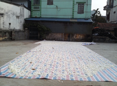 Một bãi đất trống được dùng làm nơi tập kết vật liệu xây dựng và rác thải ở sâu trong ngõ 216 Xuân Đỉnh, đã trở thành nơi phơi mứt trong những ngày cuối năm. Gần đó là một công trường đang thi công, bụi bặm mịt mù. Người phơi thì cứ phơi còn công trường vẫn cứ thi công...
