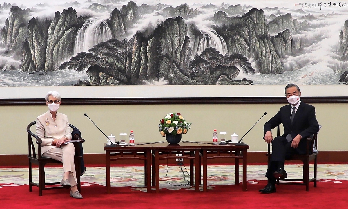 | Thư trưởng Ngoại giao Mỹ Wendy Sherman gặp Bộ trưởng Ngoại giao Trung Quốc Vương Nghị. Ảnh: AP |