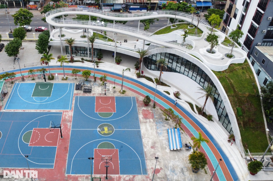 Phần mái được bao phủ bằng thảm xanh thực vật với nhiều loại cây xanh kết hợp với một đường dạo bộ trên cao, tăng tính trải nghiệm cho người dân, du khách khi đến nơi đây.