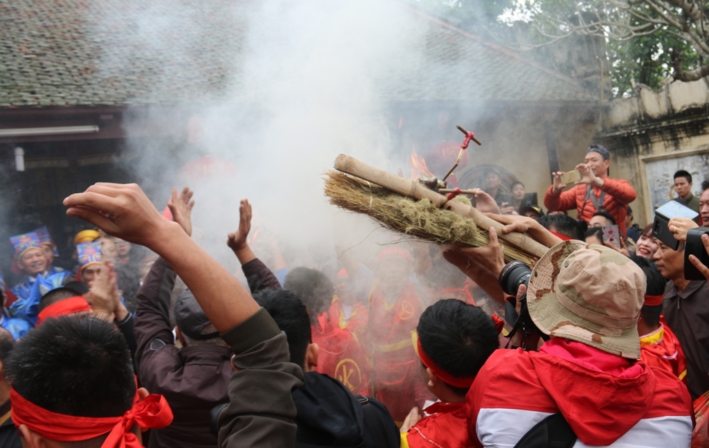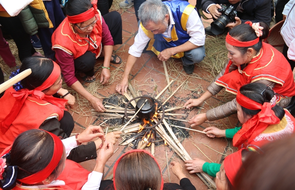 Đúng 11 giờ trưa, trai làng cường tráng kéo lửa thi thổi cơm. Ai ai cũng thể hiện sự nhanh nhẹn, khéo léo để bùi nhùi của đội mình bốc khói trắng lên trước. Mồi lửa đầu tiên bén rơm cũng là lúc không khí trong sân đình làng náo nhiệt hơn bao giờ hết. Mọi người bắt đầu đổ về chăm chút cho niêu cơm của mình.