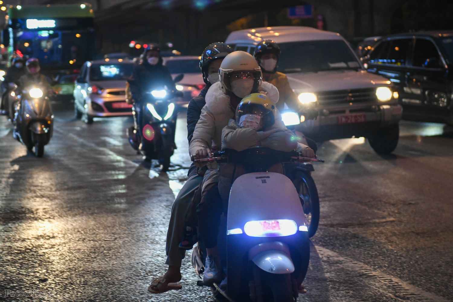 Nhiều em nhỏ cùng bố mẹ đi xe máy về quê để bắt đầu kì nghỉ kì nghỉ Tết Quý mão 2023.