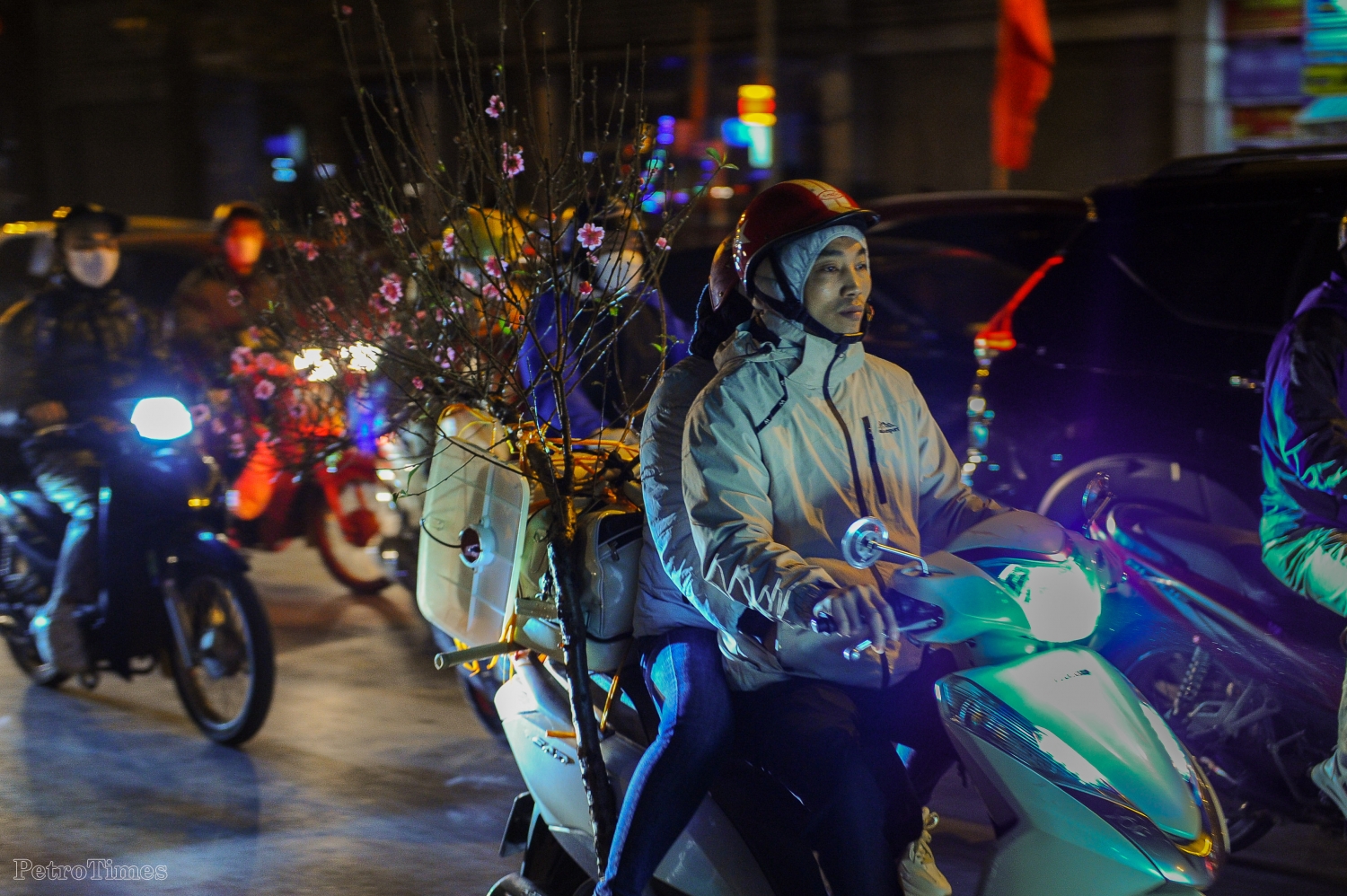 | Những cành đào từ thủ đô được mang theo về quê ăn Tết. |
