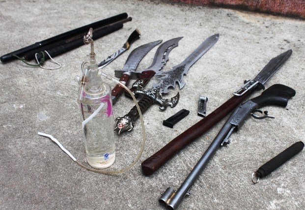 Tang vật thu giữ gồm 1 khẩu súng ngắn, 1 khẩu súng săm-lét, 3 đao, 2 dao, 2 gậy sắt, 2 hộp tiếp đạn cùng 3 viên đạn. Được biết, Thuận là anh cùng mẹ khác cha của Yến.