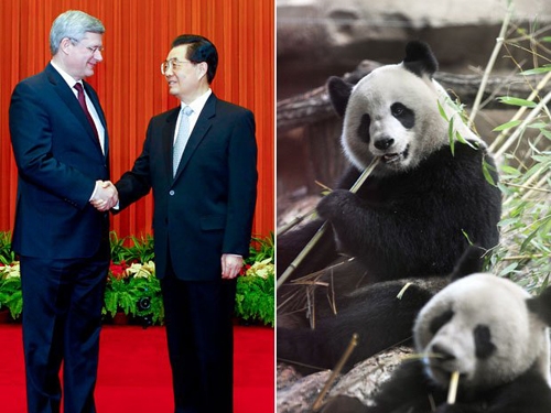 Thủ tướng Canada, Stephen Harper đã không khỏi tự hào sau khi đạt được thỏa thuận với Trung Quốc để mượn 2 chú gấu trúc trong thời gian 10 năm kể từ đầu năm 2013. Ottawa coi đây là dấu hiệu thân thiện giữa hai nước cho dù là hằng năm Canada sẽ phải chi ra 1 triệu USD để được mượn 2 con gấu trúc đó. Dư luận Canada cũng tỏ ra hài lòng khi thấy quan hệ với Bắc Kinh đang được sưởi ấm lại sau vụ Ottawa chỉ trích chế độ Bắc Kinh vi phạm nhân quyền hay tố cáo Trung Quốc ăn cắp thông tin mật trong lĩnh vực công nghiệp.