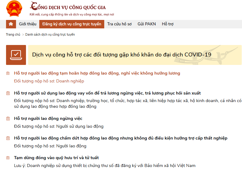 Theo đó, người lao động, người sử dụng lao động gặp khó khăn do dịch Covid-19 hiện có thể ngồi nhà, truy cập địa chỉ ncovi.dichvucong.gov.vn để tự đăng ký các thủ tục nhận hỗ trợ, bao gồm: Hỗ trợ người lao động tạm hoãn hợp đồng lao động, nghỉ việc không hưởng lương; hỗ trợ người sử dụng lao động vay vốn để trả lương ngừng việc, trả lương phục hồi sản xuất; hỗ trợ người lao động ngừng việc: hỗ trợ người lao động chấm dứt hợp đồng lao động nhưng không đủ điều kiện hưởng trợ cấp thất nghiệp; tạm dừng đóng vào quỹ hưu trí và tử tuất. Đến nay, việc xây dựng để cung cấp trực tuyến các dịch vụ công hỗ trợ người lao động, người sử dụng lao động gặp khó khăn do dịch Covid-19 trên Cổng Dịch vụ công quốc gia đã được hoàn thành.