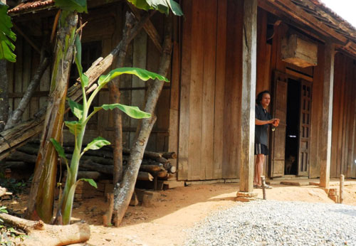 Ông Kha bên căn nhà gỗ đơn sơ.
